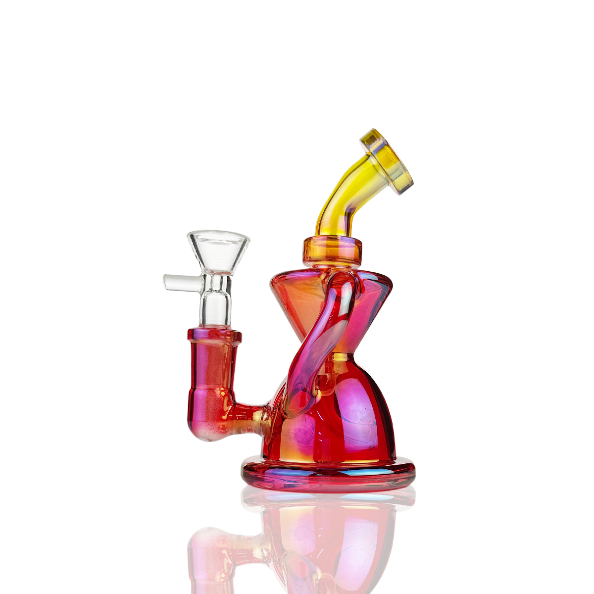 This compact 5" recycler delivers refined functionality with its electroplated finish that catches light beautifully while resisting tarnish. The recycler design filters smoke through water for a smoother experience, while the 14mm male bowl connection ensures compatibility with standard accessories. Perfect for discerning users who appreciate both aesthetic appeal and practical performance in a portable format.